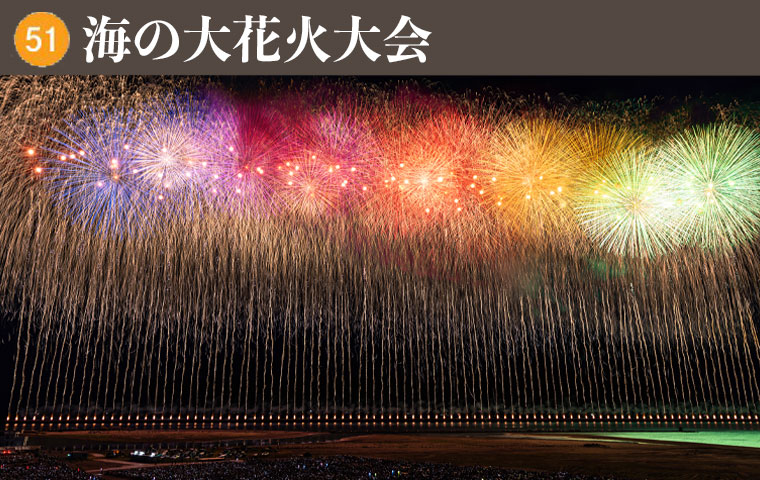 海と空を舞台に海中空スターマイン・尺玉100発一斉打上・尺玉300連発などの豪快さは越後三大花火の一つ