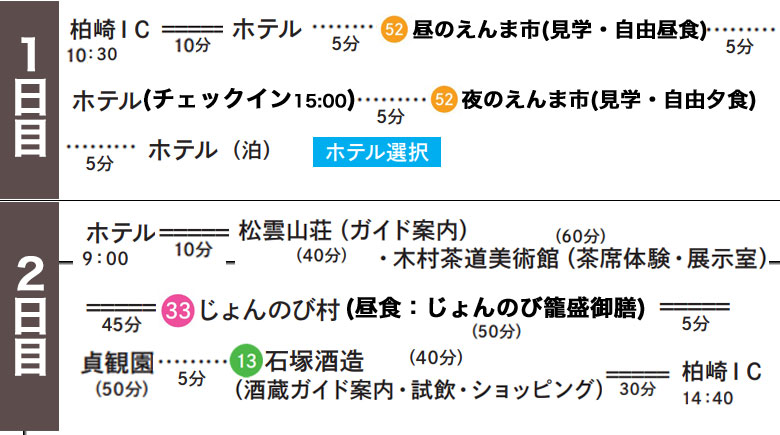 1日目は昼夜とえんま市を楽しんでいただき、2日目は木村茶道美術館の茶席体験と苔むす貞観園をめぐるコースです。